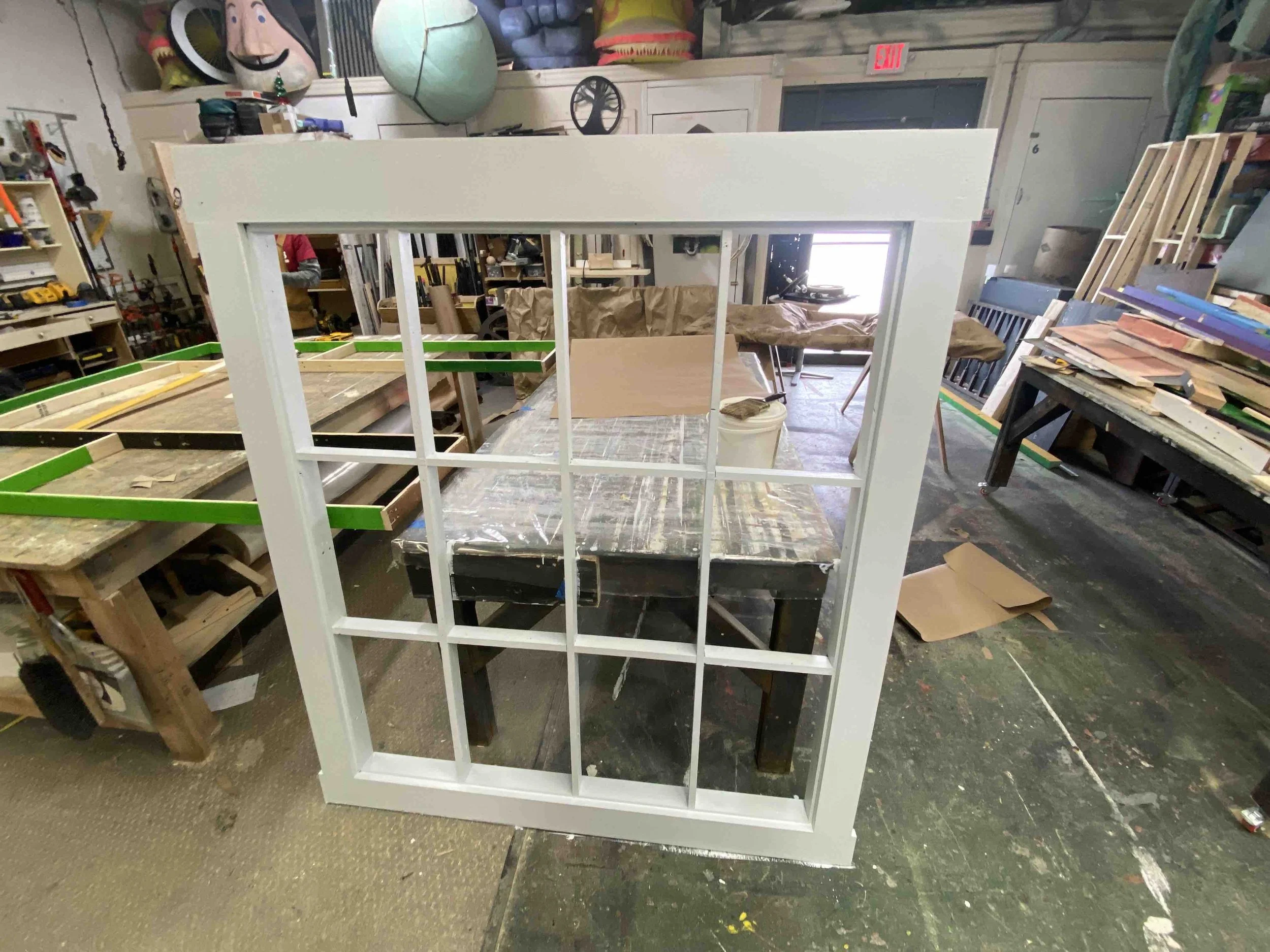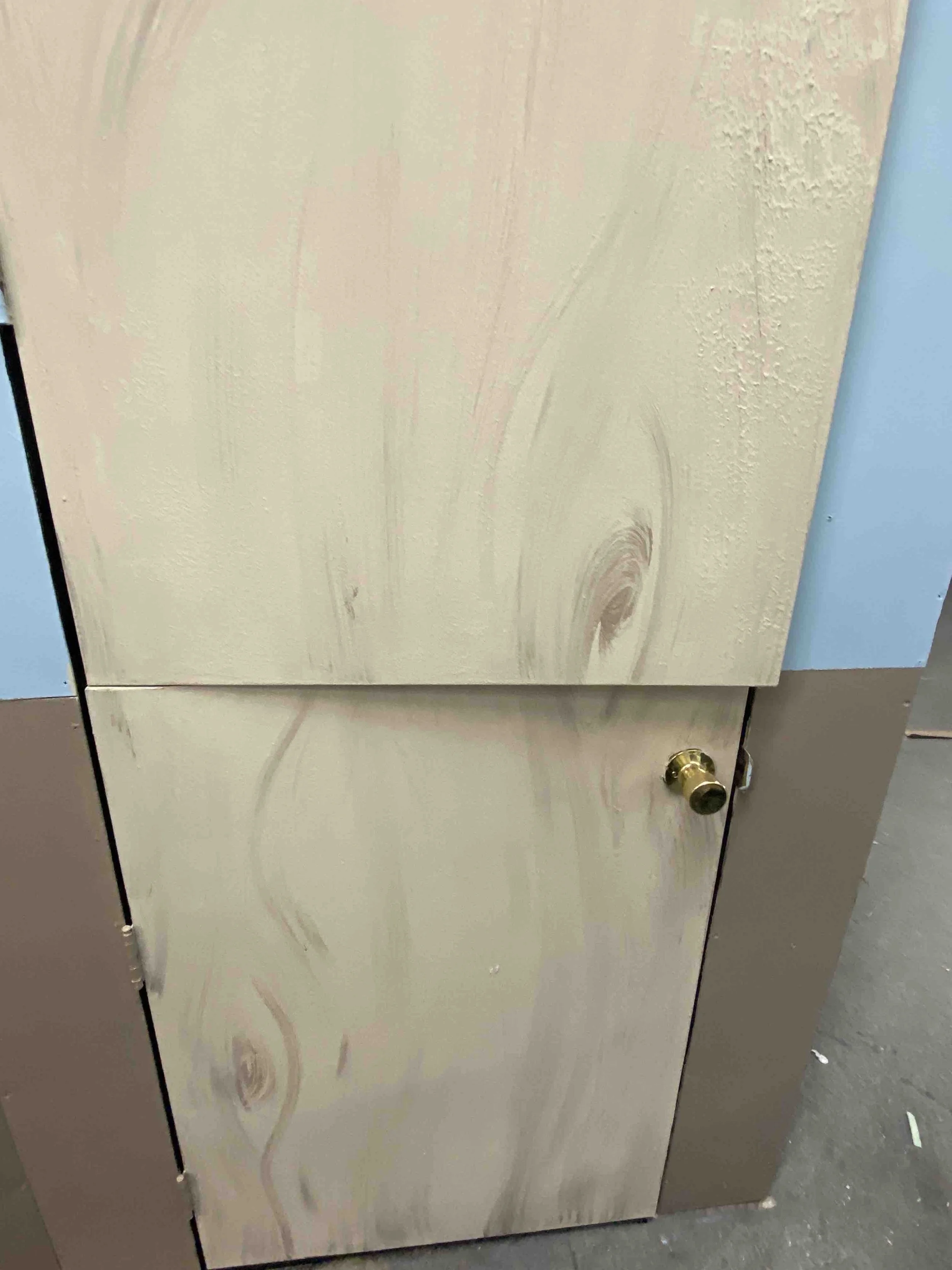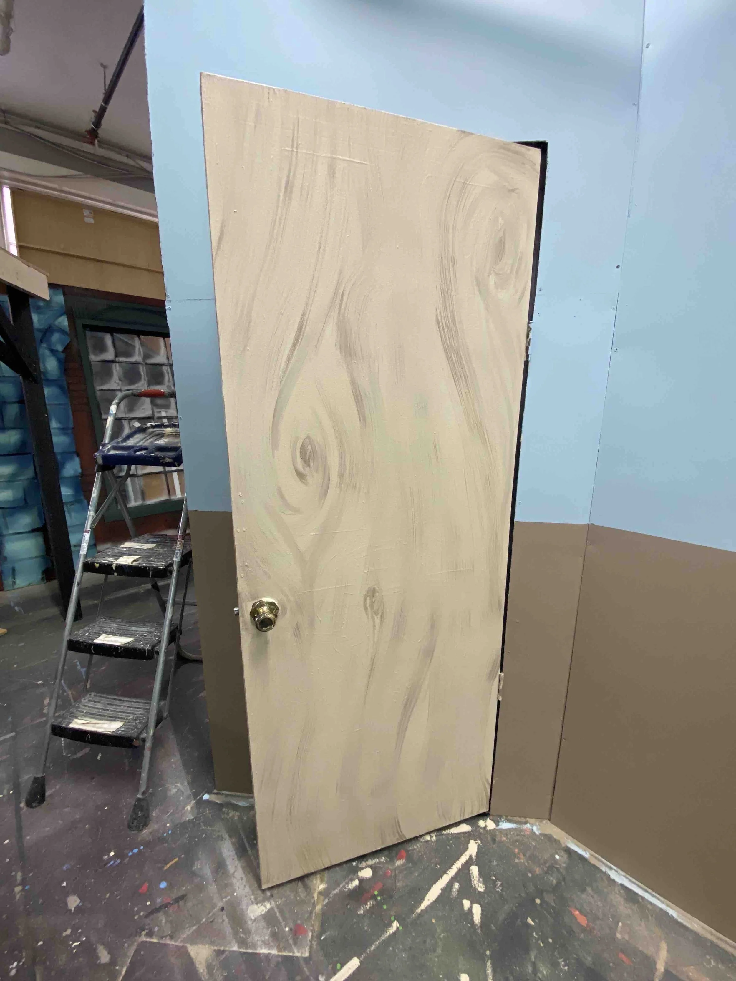 My second show at Stadium Theatre, Calendar Girls. This set was simplistic being just a set with a dual toned wall, two doors and a window frame. The wooden door textures were free handed.