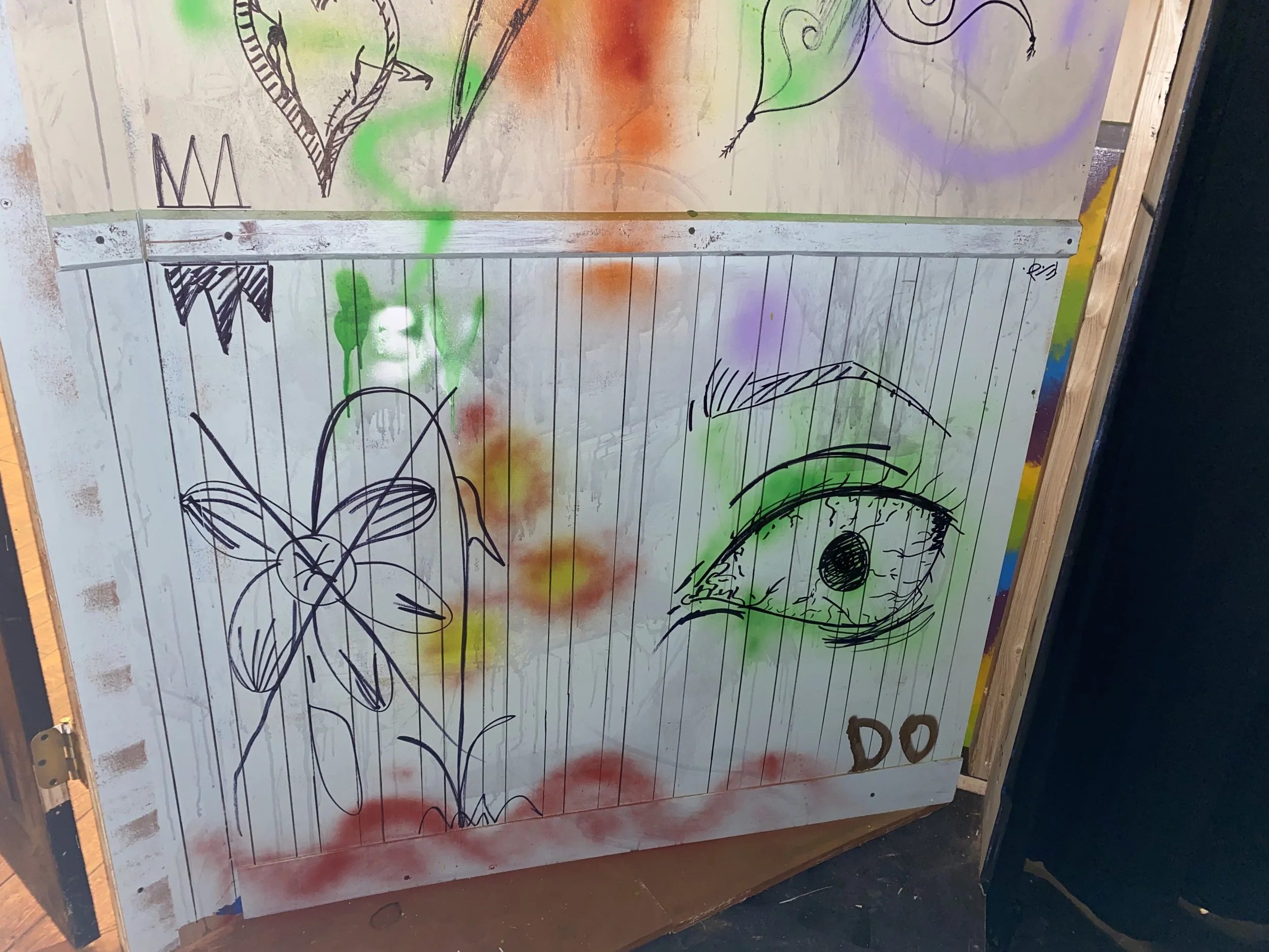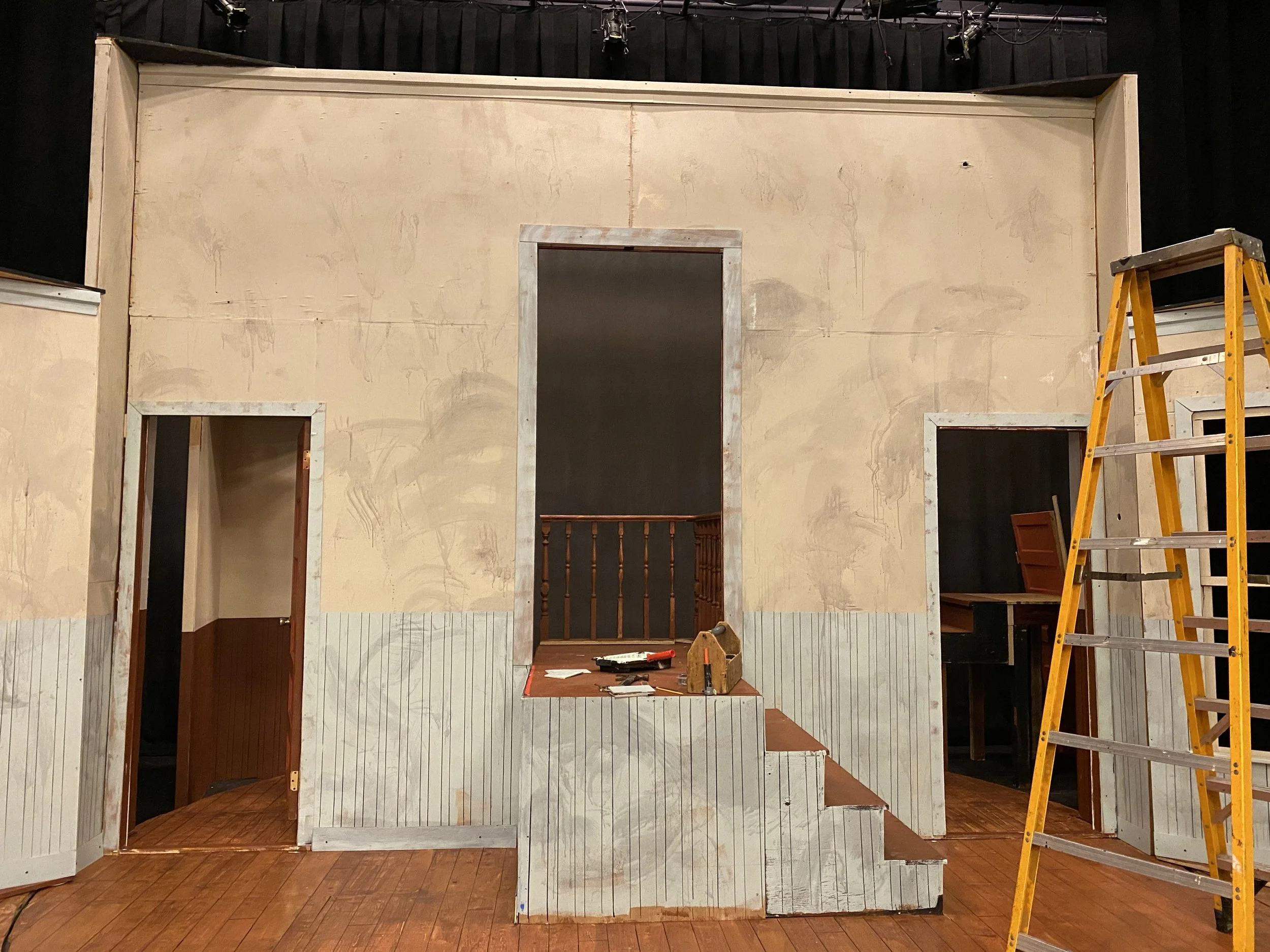 In Dean’s production of Clybourne Park, we did a revolve set separating the two acts. The first act was a nice and quaint home in the 1950’s, meanwhile the second act was the same house abandoned and graffitied in 2009. I did a lot on this project including the wooden floors, blue patterned wall paper, messy walls, some of the graffiti, and “rustification” of a chair.