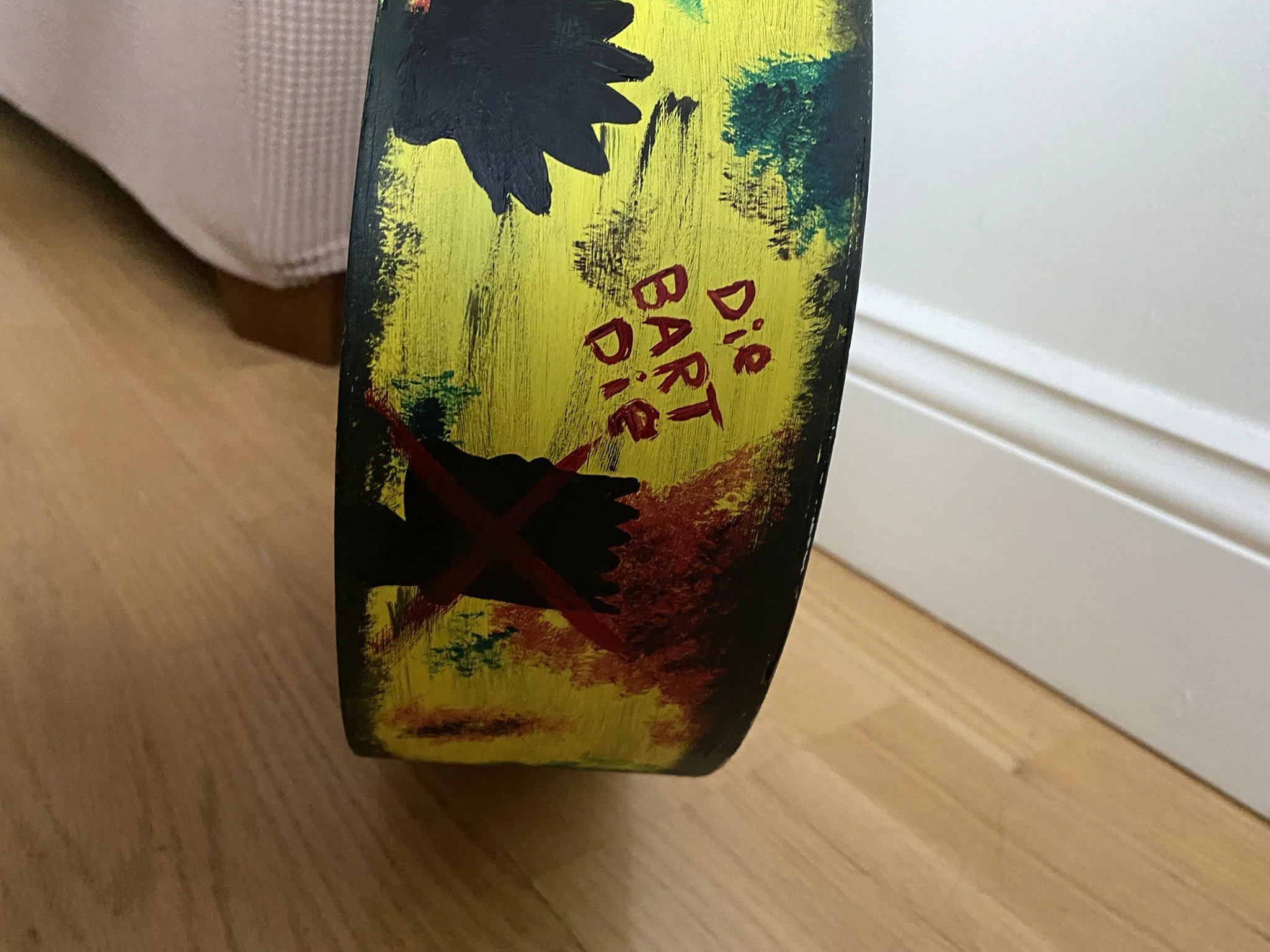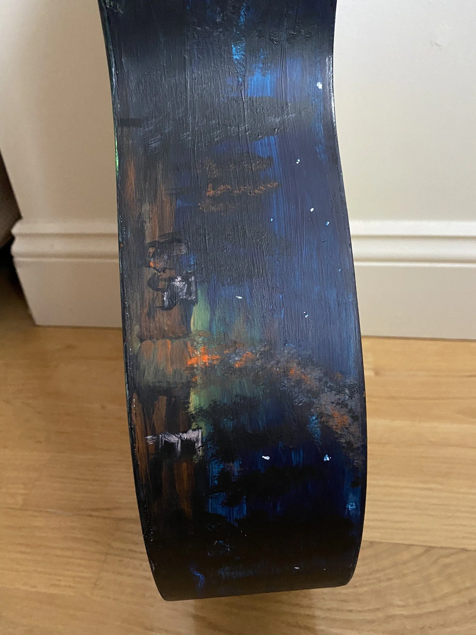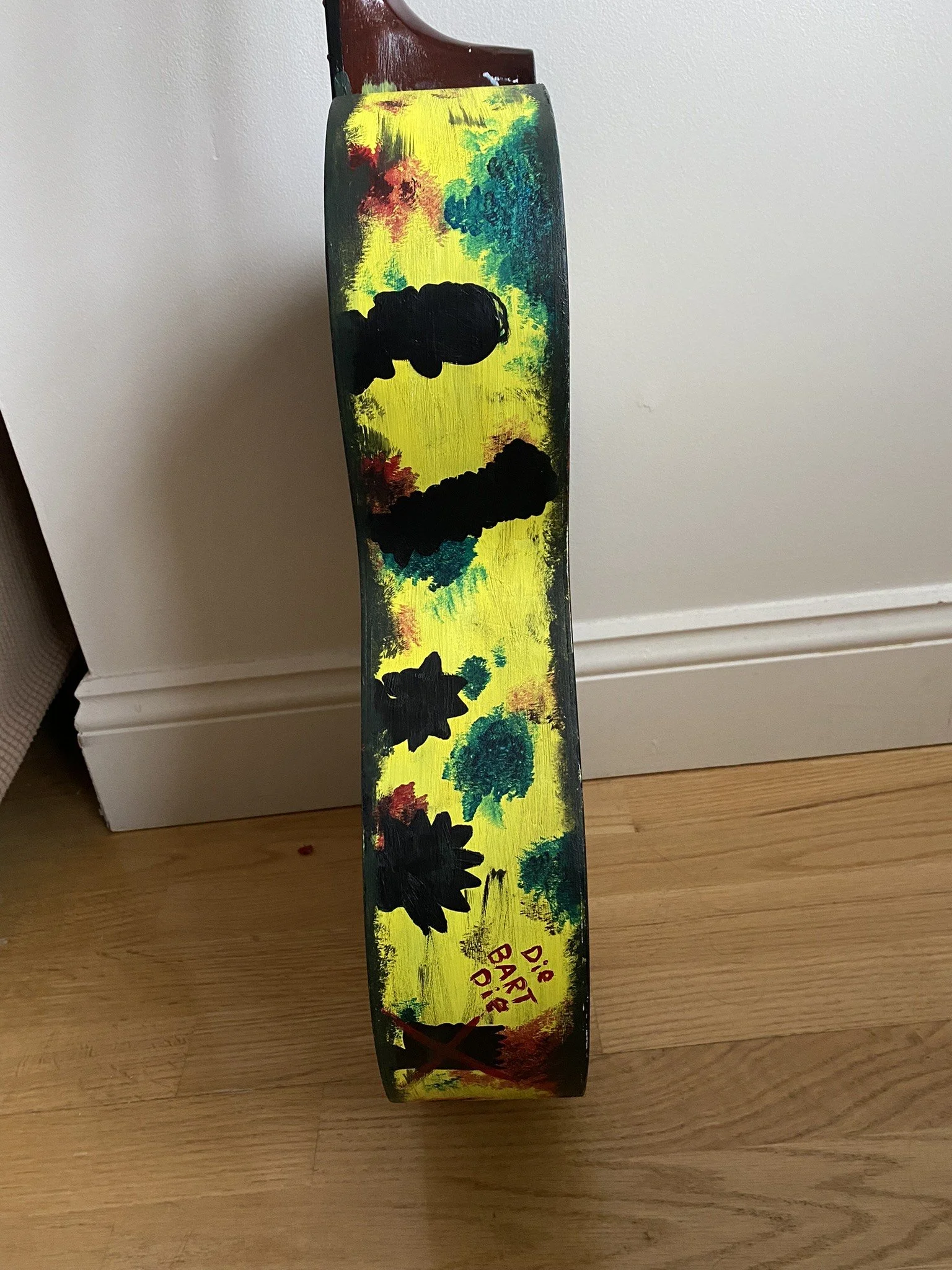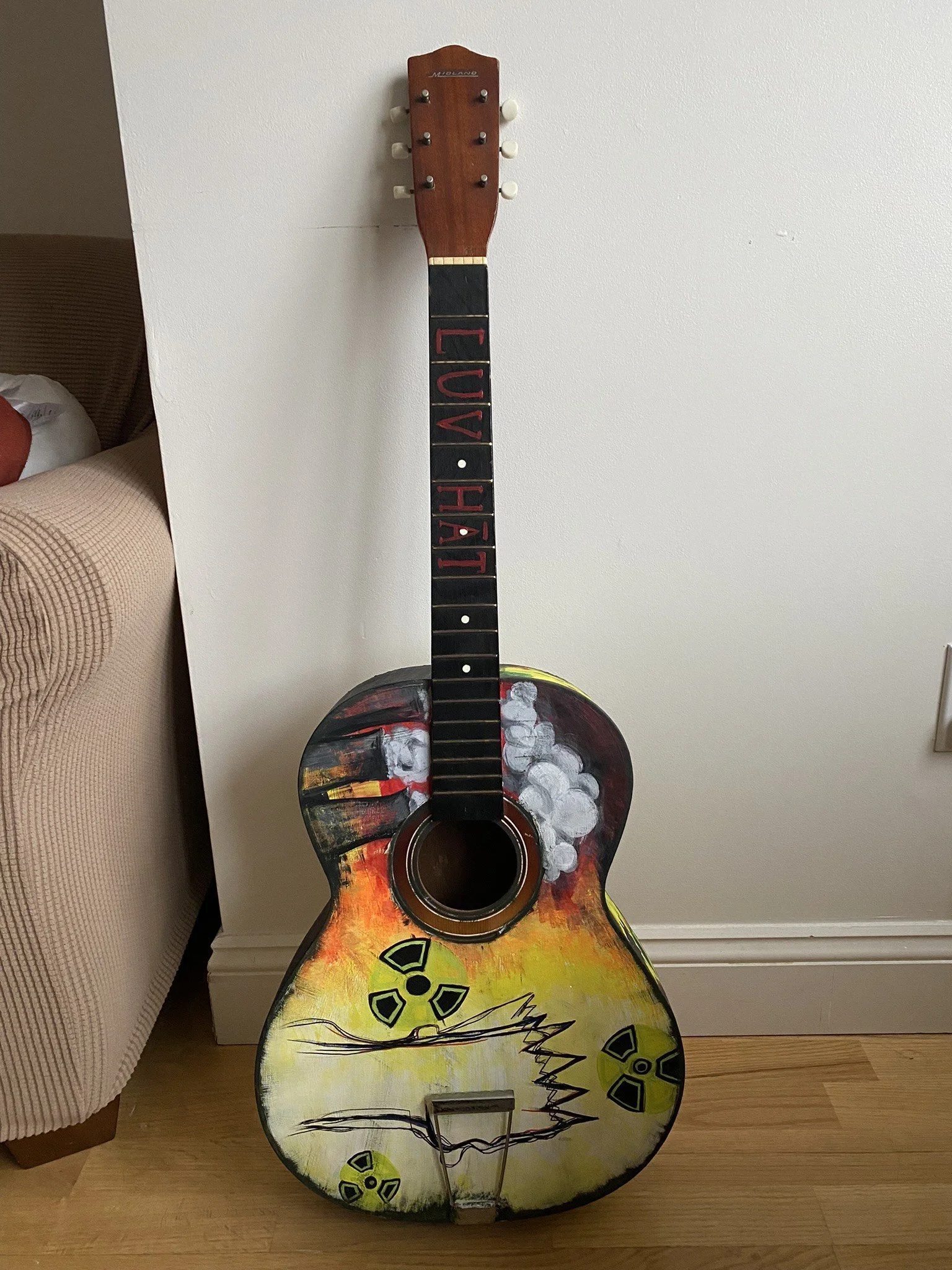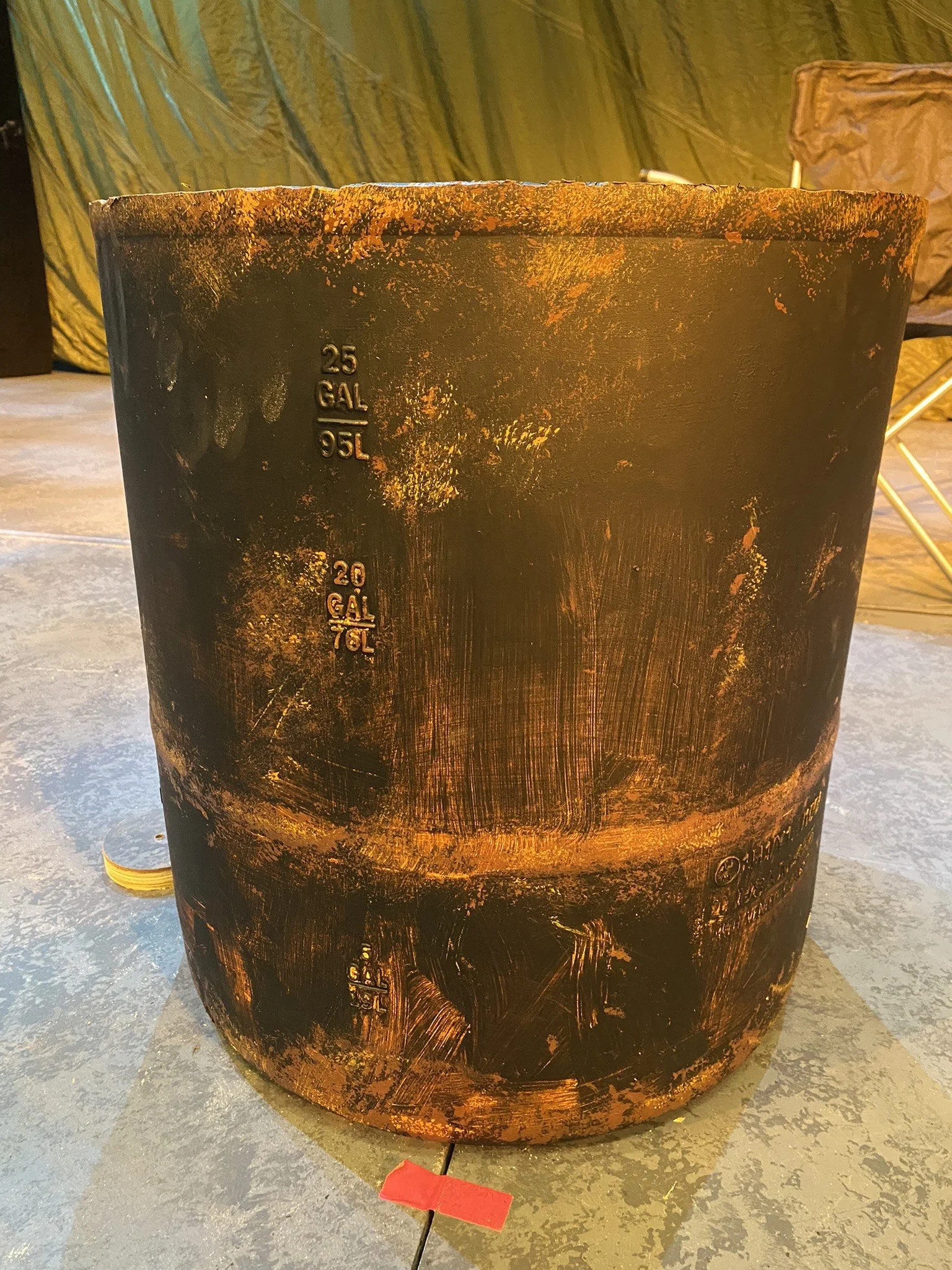 This production of Mr. Burns: A Post-Electric Play was one show I actually took a part of on stage! I acted as well as helped out with the set by painting some of the wall panels and some of the rusted pillars. I also painted a barrel and the director’s gift. I took references from the show and painted a collage on the guitar you see down below.