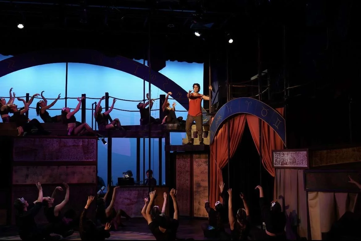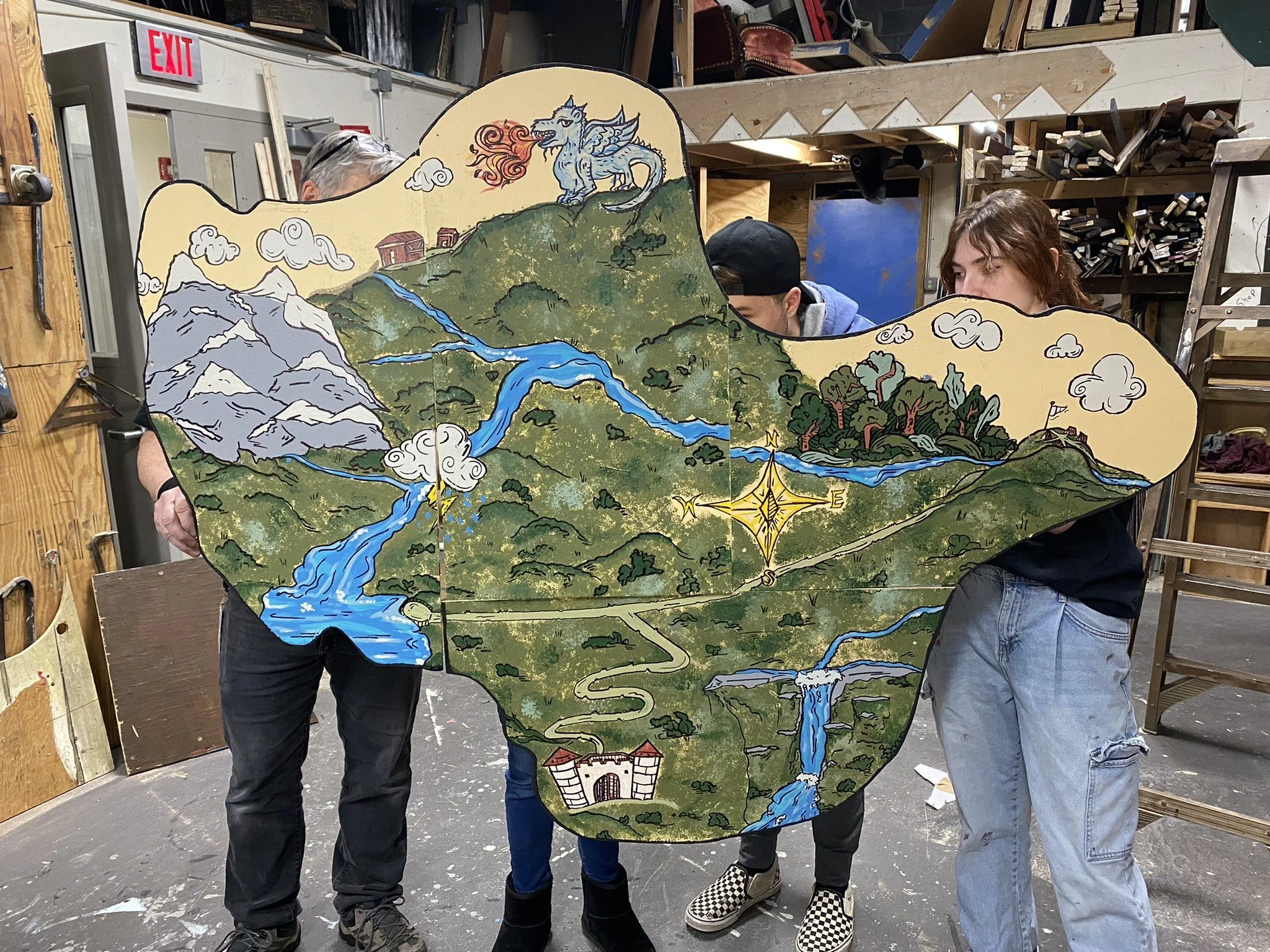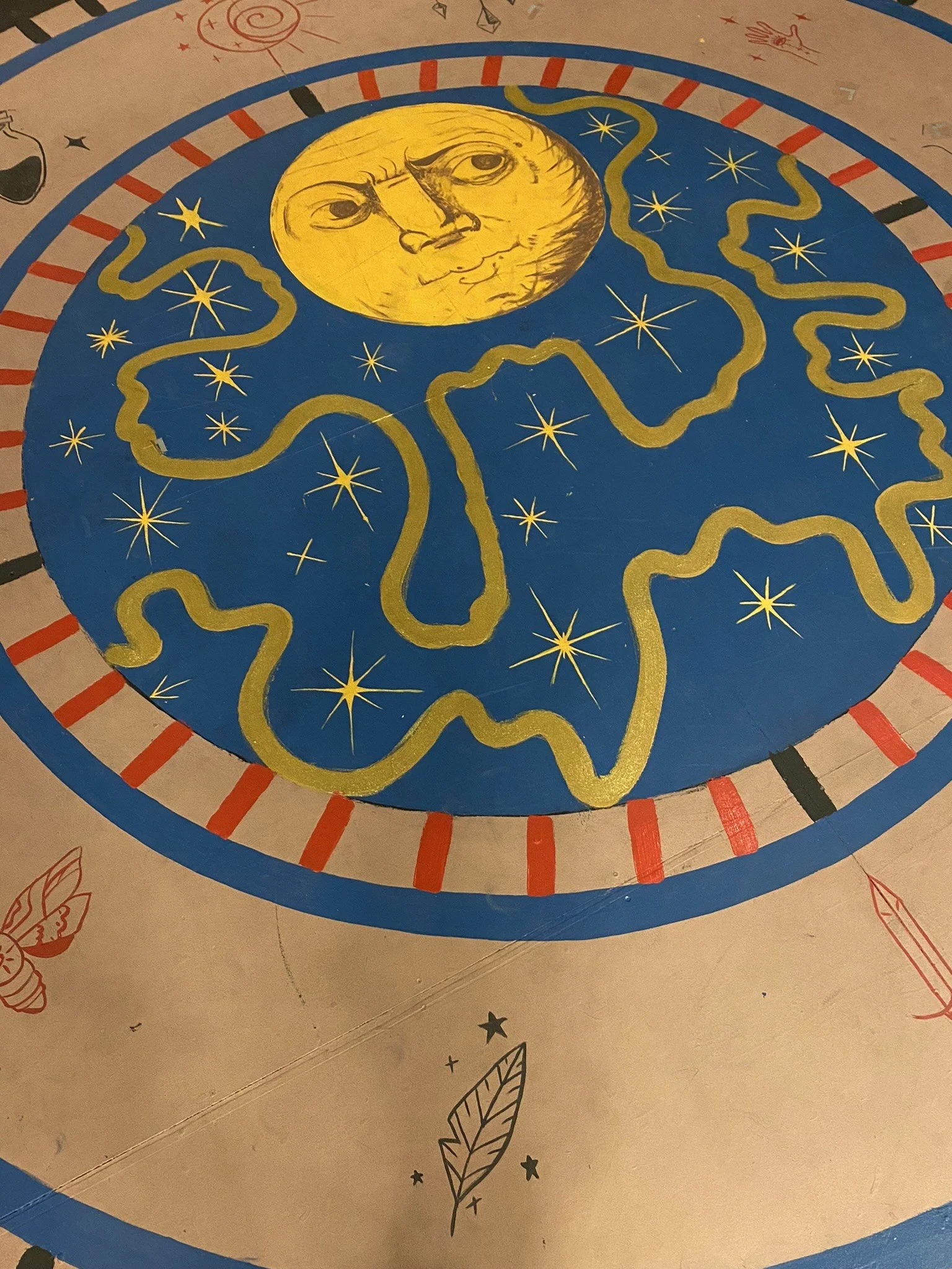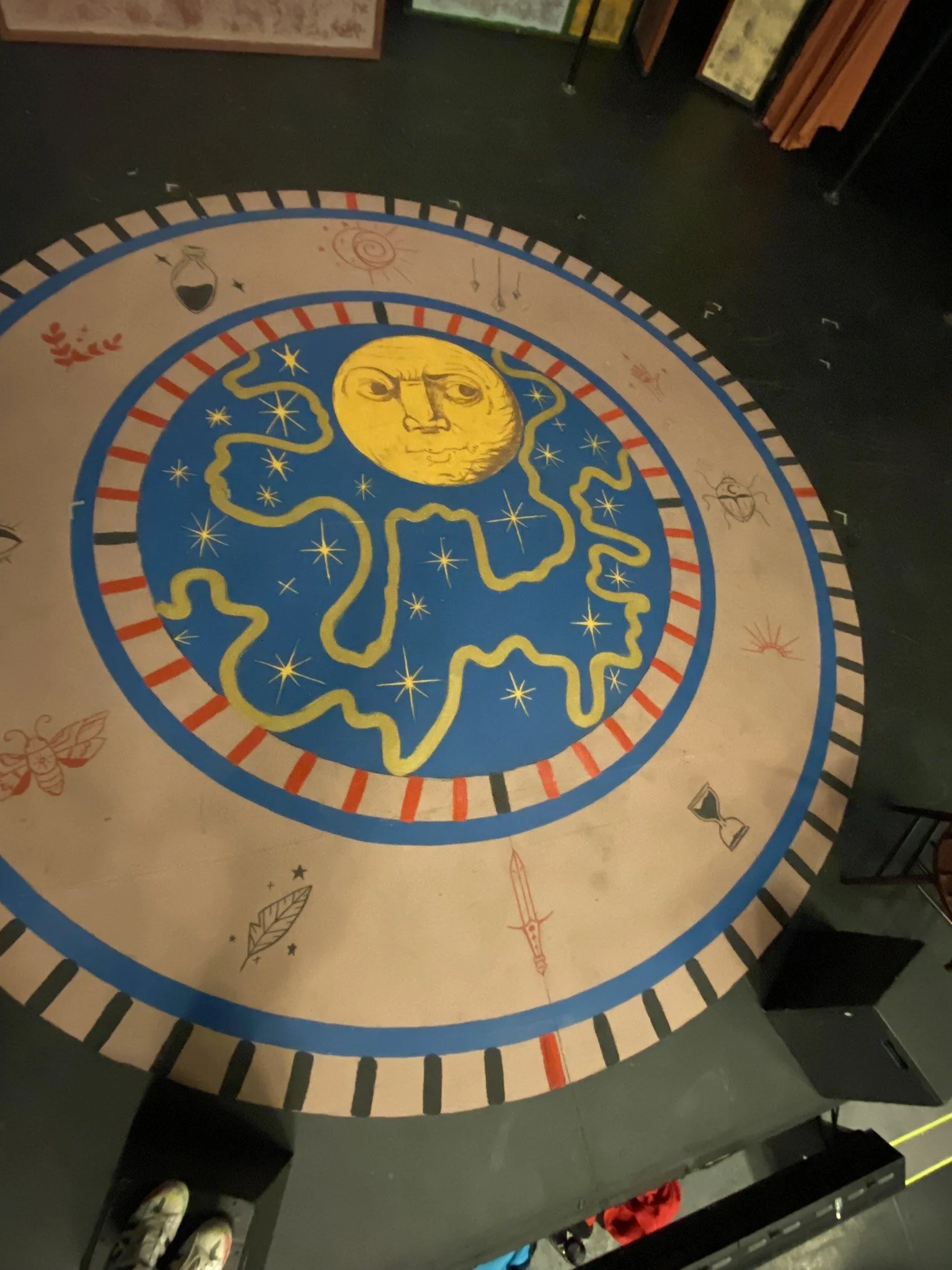 In Dean College’s Pippin, I was responsible for painting the deck centerpiece, map, and the smaller astrological arch (stage left).